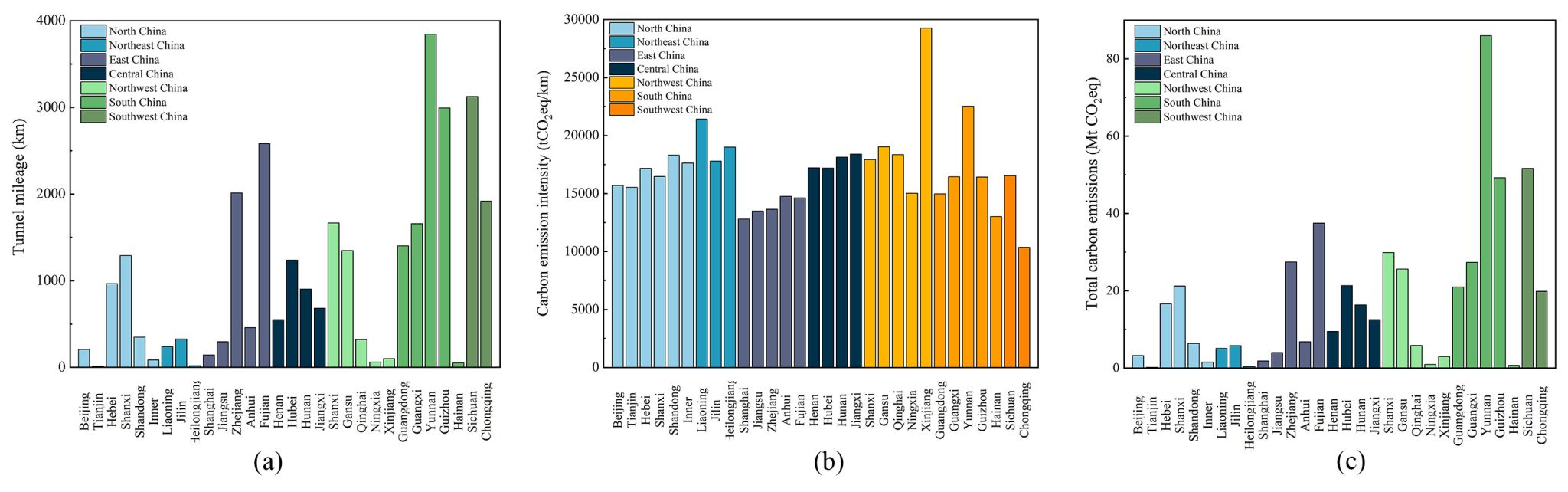 Fig.3 Highway tunnel construction mileage and carbon emission characteristics in China in 2023. a Highway tunnel construction mileage. b Carbon emission intensity of highway tunnel construction. c Total carbon emissions from highway tunnels.