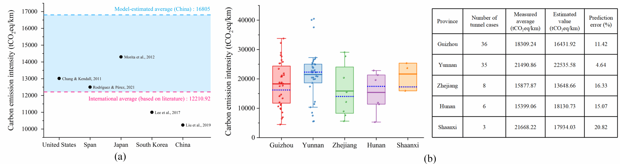 研究基于四川省典型隧道的实测数据,综合考虑电力碳因子与地质断裂带特征,构建了公路隧道建设碳排放强度的区域外推模型,系统刻画了全国30个省份的隧道建设碳强度分布特征。为验证模型的可靠性,我们将计算结果与国内外已有文献数据进行了系统对比(见图2a),并进一步收集了全国多省的隧道实际碳排放数据进行验证(见图2b)。结果表明,研究模型计算的碳排放强度与国际研究成果处于同一数量级,且与实测数据之间的平均误差仅为5.77%,验证了模型在全国范围内具有较高的适用性和精度。