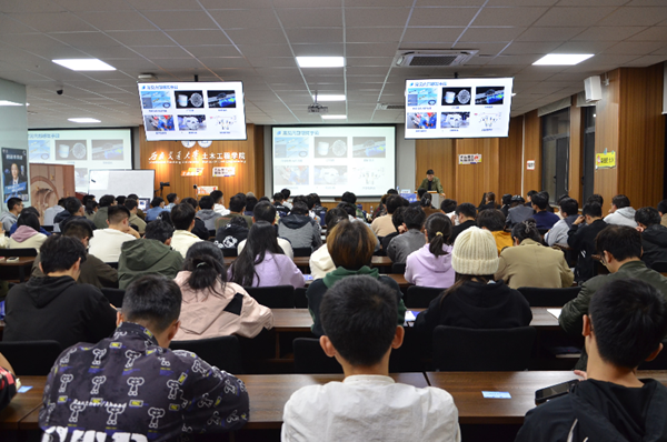 讲座伊始,由张傲南教授向同学们介绍机器学习在土木工程领域中的应用及其未来发展,并揭示智能建造在数据整合、模型构建和系统发展等方面存在的不足。紧接着,张教授从感知内容、手段及监测技术三个维度详细阐述了全息感知技术,并客观分析了集成感知装备当前所面对的挑战。