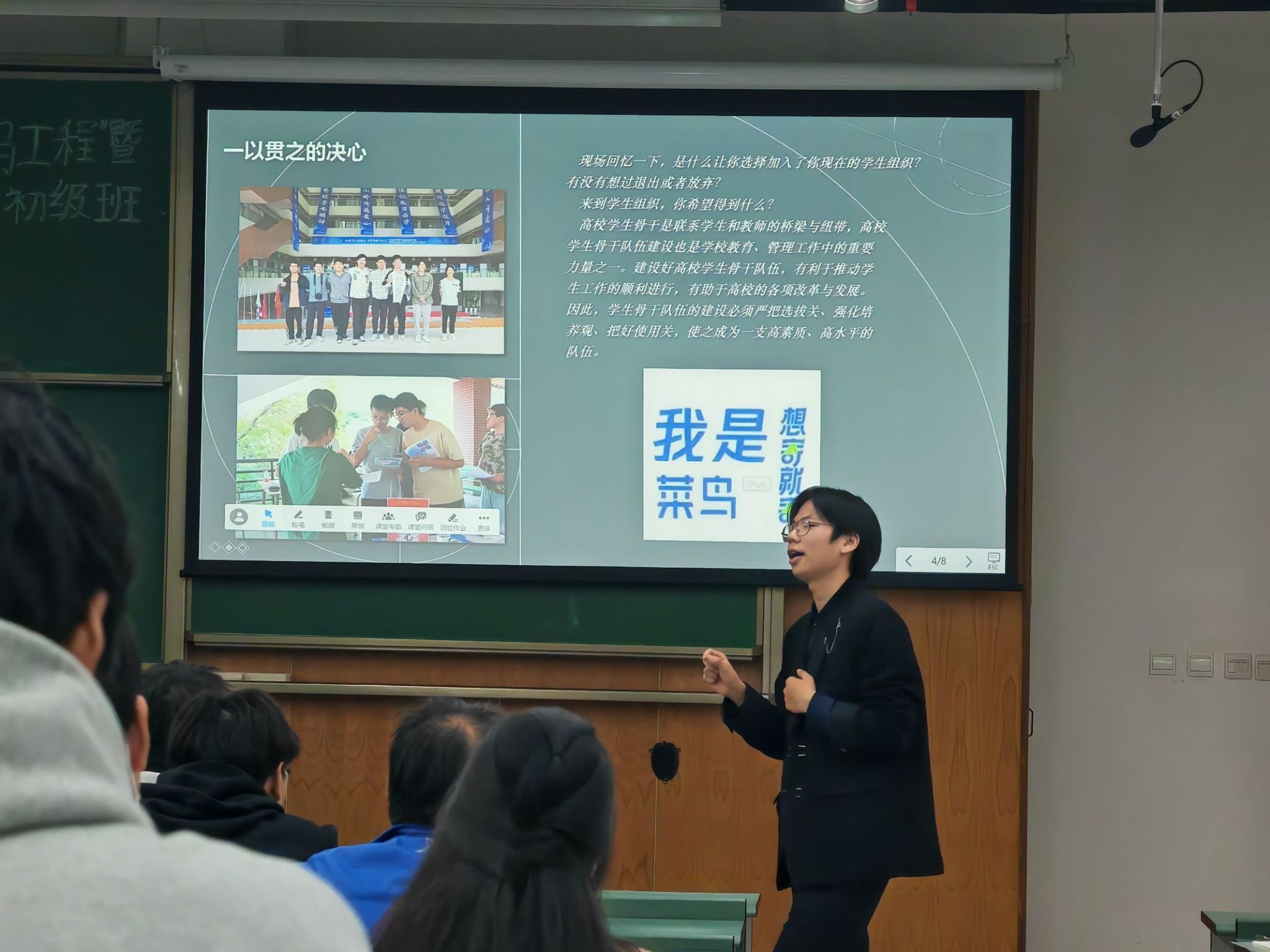 谭力豪老师从自身经历出发,将自己大学时期担任班团干部的工作经验进行分享。谭力豪老师指出,想要做好班团干部,需要做到脑勤、口勤、手勤、脚勤,切忌吹嘘做法、感情用事、被动应付、清高态度和专横态度。同时,班团干部们应当不断提升业务能力,建立有效快速的跨班机制,以此加强班级凝聚力和班与班之间的联系。谭老师期望班团干部们能够积极发挥榜样引领作用,努力成长为一名可靠、可信的优秀学生干部。