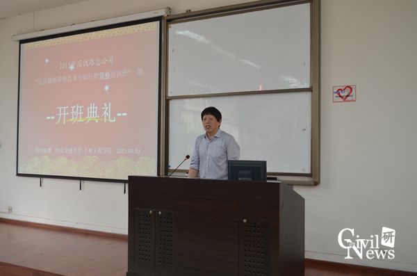 首先,土木工程学院副院长任宝良对各铁路局学员的到来表示欢迎。他简要介绍了西南交通大学的悠久历史及学校120周年校庆准备情况。任副院长说到,土木工程一直是学校的优势学科,在国内处于领先地位,同时,学校十分重视铁路总公司下达的培训任务。任副院长结合铁路国际化及“一带一路”的背景,讲述了国内外铁路行业对技术人员的新要求,承诺学校将配备优秀的教学资源,保证教学质量,希望各学员结合铁路局运营与管理方面的实践,充分吸收培训内容,实现教学相长,真正提高自身技术水平和专业素养。