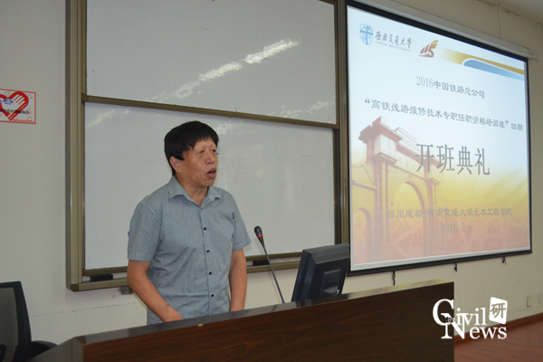 2016年7月6日早上8点整,2016年中国铁路总公司“高铁线路维修技术专职任职资格培训班”第四期开班典礼在九里校区信息楼0222教室如期举行,土木工程学院副院长任宝良以及培训班老师出席典礼,来自全国各个铁路局的相关领导及员工悉数到场。会议由土木工程学院继续教育中心江富长老师主持。
