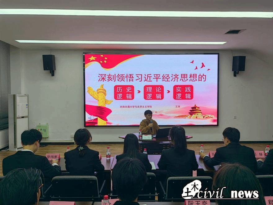 2023年11月10日,依托西南交通大学“时代新人铸魂工程”大学生日常思想政治教育精品项目,土木工程学院“红志”骨干培训班(第四期)正式开班。为使学员深刻领悟习近平新时代中国特色社会主义思想的历史逻辑、理论逻辑及实践逻辑,学院邀请马克思主义学院博士宣讲团骨干成员王浪博士,为学员们举行开班第一课,并与同学们深入交流,深化学员们对习近平新时代中国特色社会主义思想的认识。
