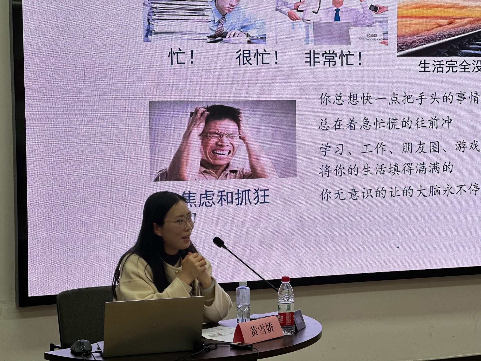随后,黄老师倡导同学们要专注当下,提高效率。要适时的盖上时间管理的天敌——手机,抵抗住诱惑,不要分心,让自己专注于眼前的工作上。同时,让自己的学习或工作环境保持良好的秩序,可以减少很多浪费在找东西上的时间,从而提高效率。调节心情,注重运动也是可以提高效率的好方法。