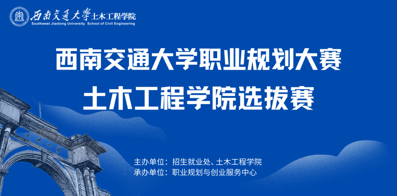 土木工程学院职业规划大赛是一项由西南交通大学招生就业处、土木工程学院主办,面向全院学生开展的职业生涯规划指导活动。旨在引导大学生树立正确就业观念、提高大学生生涯教育和就业指导水平、促进高校毕业生高质量充分就业。现就赛事相关事宜通知如下:
