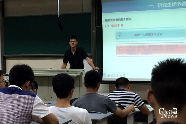 为了让2017级研究生新生对学校和学院有一个更深入的了解,尽快地适应交大的研究生生活。9月7日晚上19:00,研究生辅导员叶礼宁、吴琴在逸夫馆4323为同学们作了题为“研究生日常教育管理专题”的讲座。