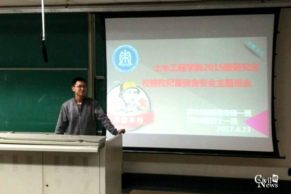 为通过校园安全知识的普及,进一步增强同学们的宿舍安全意识,提高自我保护能力,构建安全和谐的校园环境。2月23日晚,土木工程学院研究生2016级岩土工程1班与桥梁专硕1班于逸夫楼4209教室顺利开展了“学生宿舍安全教育”主题班会活动。班会由16级桥梁专硕1班班长唐谐波、岩土班班长艾健森共同主持。