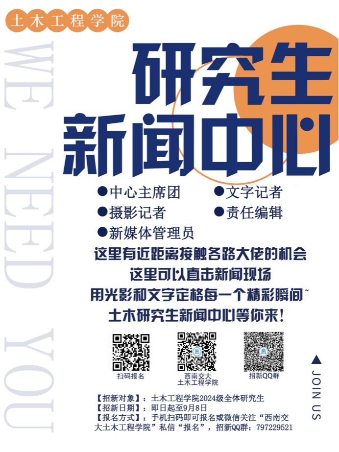 土木学院研究生新闻中心隶属于土木工程学院,是学院新闻信息发布的重要平台和对外宣传的有效窗口,因工作优异,稿件数量和质量突出多次荣获“校研究生宣传工作团队优秀组织奖”和“校十佳媒体”称号。在过去的一年里,研究生新闻中心以贴近实际、贴近生活、贴近学院为基准,举办了国奖人物专访、忠忱班集体、扬华人物等多项活动,承担了大量学院、系室以及研究生活动的宣传报道工作,展示了学院风貌,弘扬了土木文化。值此开学迎新之际,研究生新闻中心向土木学院全体研究生发出邀请,只要你热爱新闻事业,愿意为学院新闻宣传工作出力尽责,我们热忱欢迎你的加入!