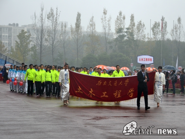 在主持人刘旭宣布运动会开幕式正式开始后,同学们满怀好奇地观看裁判员、运动员入场,运动员们英姿飒爽,迈着整齐划一的步伐缓缓经过主席台,观众席上不时传来阵阵掌声。新成立的马克思主义学院的运动员别出心裁的造型变换赢得观众的赞美。土木学院的运动员满怀热情,踏着稳健的步伐走过主席台,用谦逊温实挑起交大中流砥柱的大任。西南交通大学子弟小学、西南交通大学附属中学也分别派出运动员参加此次运动会开幕式,带给观众年轻的活力与别样的惊喜。工程训练中心、远程与继续教育学院、图书馆、后勤保障处、校办产业集团、牵引动力实验室、校机关以及茅以升学院、利兹学院也参加了本次运动会。最后入场的“四海英才,桃李五洲”的留学生方阵赢得观众阵阵呐喊,他们挥舞着中国国旗和其祖国的国旗在《我和你》的旋律中微笑着进场,向观众挥手。