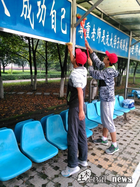 上午八点,交通三队所有成员分为两组,在队长们的带领下分别来到犀浦校区南北区校车站。队长们现场分配了每位干事的任务并派发了打扫工具,叮嘱大家在打扫的过程中注意安全。个子最高的张迎港同学负责清洗候车棚顶部的宣传标语。由于太久没有打扫,标语上已经覆盖了一层厚厚的泥土,清洗过后就像崭新的一样。把校车站打扫干净后,志愿者们又对破损的椅子进行了修补,并把所有椅子摆放整齐。最后,他们在校车站张贴了交通安全知识宣传海报,并对校车站进行美化。所有任务完成后,交通三队所有成员来到南区校车站对当天上午的活动进行了总结,并合影留念。