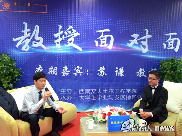 教学中的苏谦教授对于英语的要求是很高的,教授认为,英语在国际技术交流,互相学习的过程中起着催化剂的作用,我们应该快乐的学习英语,常听英文歌并这些把英语学习融入日常生活中去。苏教授谈及我们以后的规划时说到,我们学校的交通烙印是很强的,有质量与数量都靠前的国家实验室,我们西南交通大学土木的学生有很多选择,五个系,八个方向,在自己没有明确自己的兴趣之前就先学排名靠前的项目。