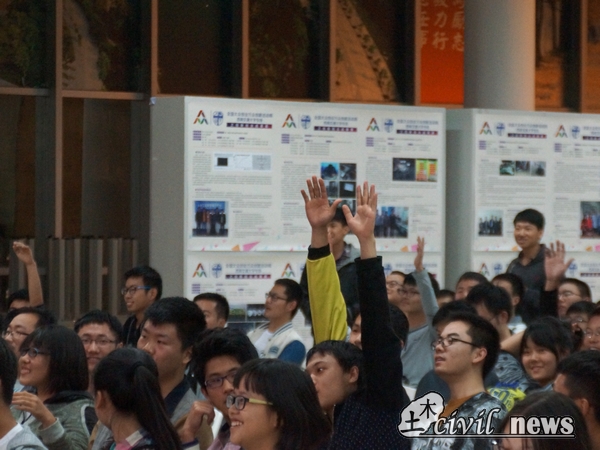 在讲座最后的知识竞答环节,工作人员给出了选择题和标志题两种题型,题目出现在大屏幕上,同学举手作答,由主持人随机点到一个举手的同学。回答正确便有小礼品赠送。同学们也都踊跃参与,积极回答问题。不过有一道标志题难度较大,同学们都犹豫着没有举手,最后在主持人的提示下,才有同学答出正确答案,总而言之,现场的气氛非常活跃,而同学们在本次讲座中收获的不仅仅是快乐,更是王梦恕院士那在困境中磨练出的坚毅质朴的品质以及秦顺全院士那能够为梦想披荆斩棘的勇气和毅力。