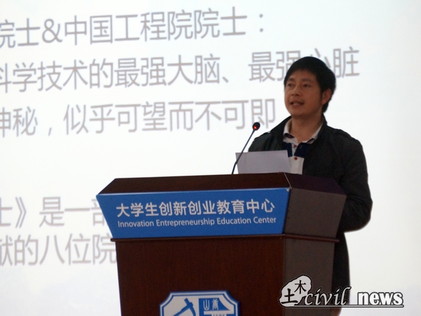 接着,土木工程学院的夏嵩老师又上台为我们讲述了秦顺全院士的生平经历。出生于四川绵竹一个普通农民家庭的秦顺全院士,大学开学便爱上了造桥,虽然家境并不宽裕,但秦顺全院士并没有因此而放弃梦想,经过自己多年来的不懈努力,秦顺全院士不仅在西南交通大学获得了工学硕士学位,而且在造桥事业上也取得了丰硕的成果,并成为了中国工程院最年轻的桥梁院士。秦顺全院士的这种能够为梦想不断向前的坚毅品质,让我们在场的每个人都深受启发,也让我们每个人都对自己的大学生活有了新的规划。
