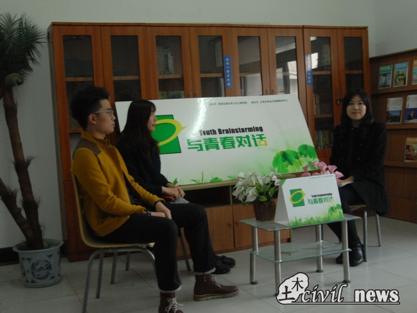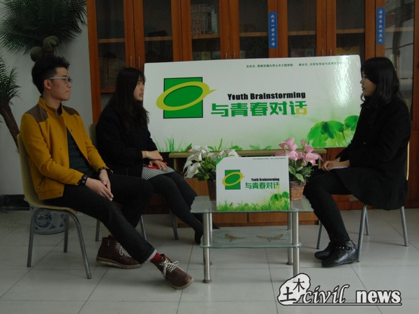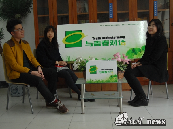 11月6日下午4点,bat365中文官方网站的首档青年思想秀——“与青春对话”访谈节目在天佑斋6号楼的党建室开始了。此节目由土木学院的大学生学业与发展指导中心承办,旨在让优秀的交大学子分享自己独特的大学生活经验与感触。而此次访谈的受邀嘉宾是2012级的杨瑱冉同学和2013级的许晓冬同学,他们因近期在学业上的突飞猛进而备受关注,在下面三十分钟的访谈时间里,主持人孙君将会让两位嘉宾谈谈各自的学习感悟。