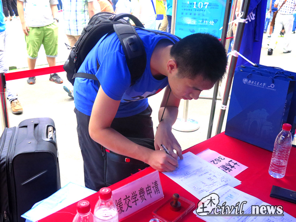 临近中午,来报到的新生越来越多,迎新点显得十分忙碌。报道注册、领取一卡通、领取新生大礼包和缓缴学费学生填写申请等地都挤满了人。虽然工作繁复、艰巨,但是各位工作人员都恪尽职守,一丝不苟地做着自己的工作。完成上述步骤后,各位新生在助辅的陪同下,顺利入住了今后四年属于他们自己的小窝。