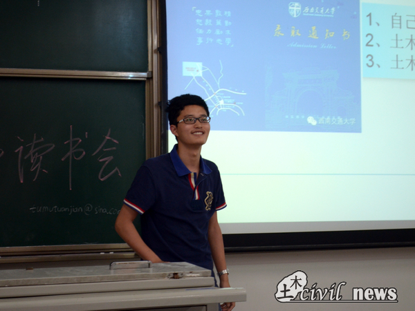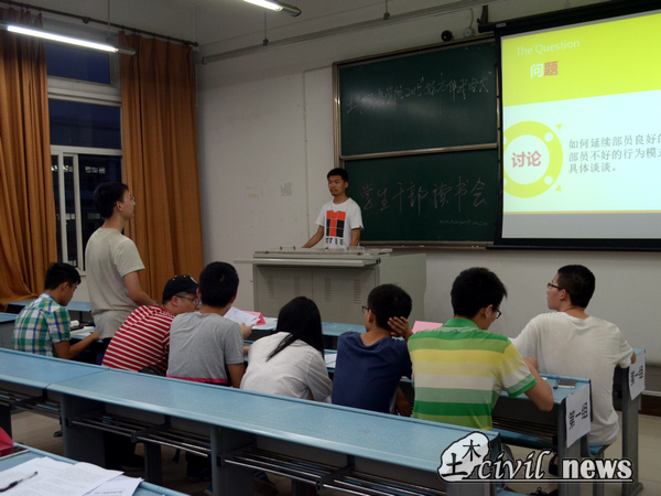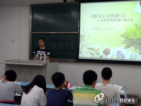 5月27日7点半,由土木工程学院团建中心组织的“好书伴我成长”活动在2428准时举行。本期推荐书目为安东尼·罗宾的《激发心灵潜力》,活动以学生干部工作及其潜力的发掘为主线,结合实际工作问题,在轻松、活泼的氛围中互动,帮助学生干部深化对工作理念和方式的学习和理解。