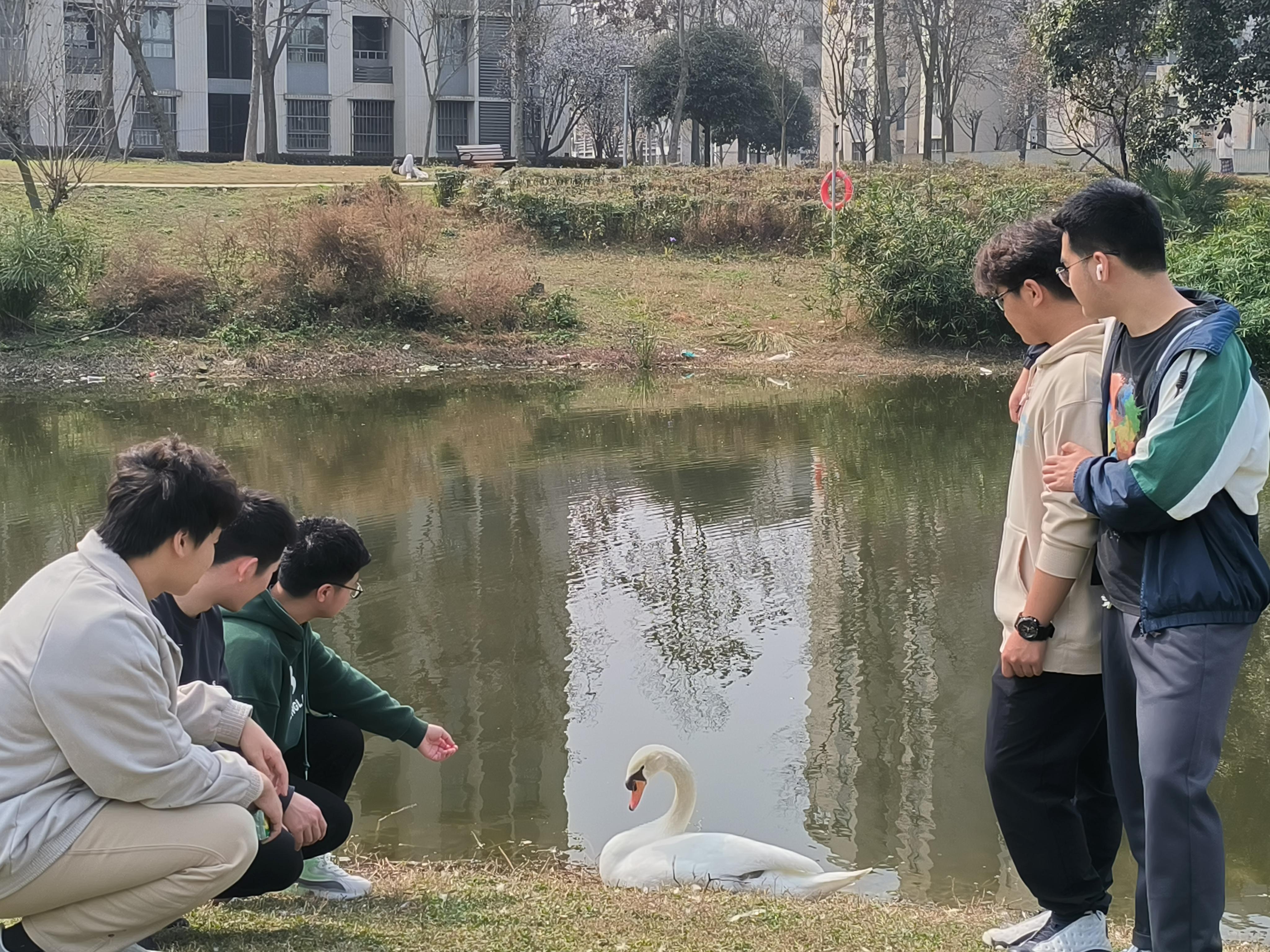 时逢早春,景色正好,午后阳光十分和煦,湖面波光粼粼,值此春景,3月5日下午2:00,土木园区管理中心举办了“校宠卫士”活动,同学们积极参加,争相与校宠天鹅共赏春色,而我们的校宠天鹅在湖中悠然自在,亦或是与游人互动。岸上春花烂漫,草木待苏,如此春景,与伊人共赏,或是一人游融入这美景中,时而与校宠来一次亲密的互动,也算是一段惬然的时光。