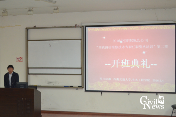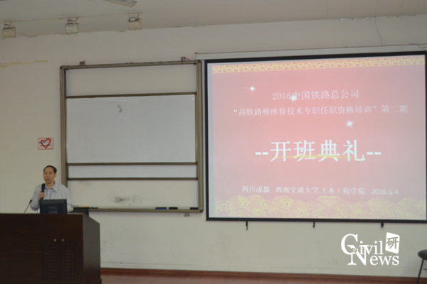 5月4日,中国铁路总公司“高铁路桥维修技术专职任职资格培训班”第二期开班典礼在九里校区信息楼0222会议室隆重举行。早上8:30,西南交通大学土木学院副院长任宝良、继续教育中心书记江富长准时来到典礼现场,共同见证这个重要的时刻,开班典礼由土木工程学院继续教育中心江富长书记主持。