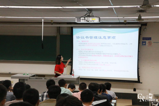 9月28日下午6:30,由土木工程学院车小洁老师在逸夫楼4409教室给2019届毕业生做了学校关于就业政策的一次宣讲。