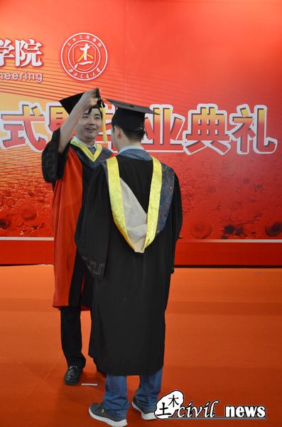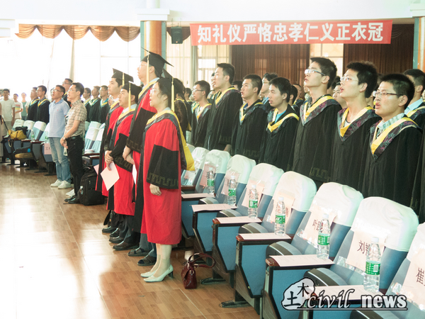 下午2点半,在雄壮的国歌声中,土木工程学院2015届本科毕业生工学学位授予仪式正式开始。易思蓉教授首先宣读了《土木工程学院2015届本科生毕业及授位决定》。决定表示,四年以来,2011级同学勇于担当、志存高远,在学习生活中攻坚克难、不断进步,发扬“竢实扬华,自强不息”的交大精神,取得了优异的成绩,决定授予2011级的424名同学工学学士学位。希望他们在今后的学习、工作和生活中,再接再厉,创造新的辉煌!随后,高波教授、钱永久书记、易思蓉教授和苏谦教授分区依次为毕业生逐个授学位礼并合影留念。