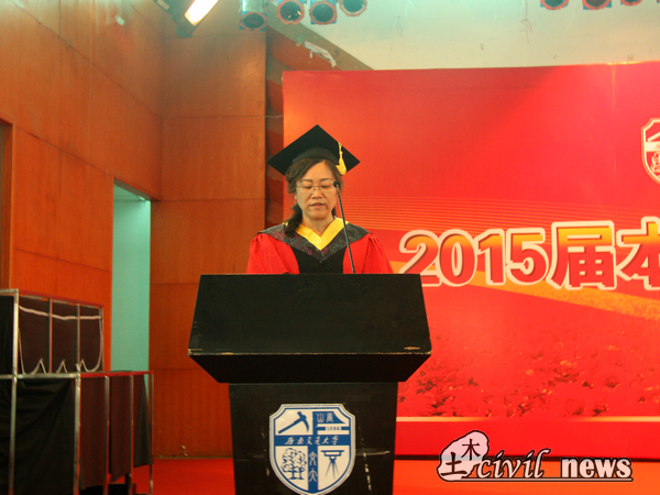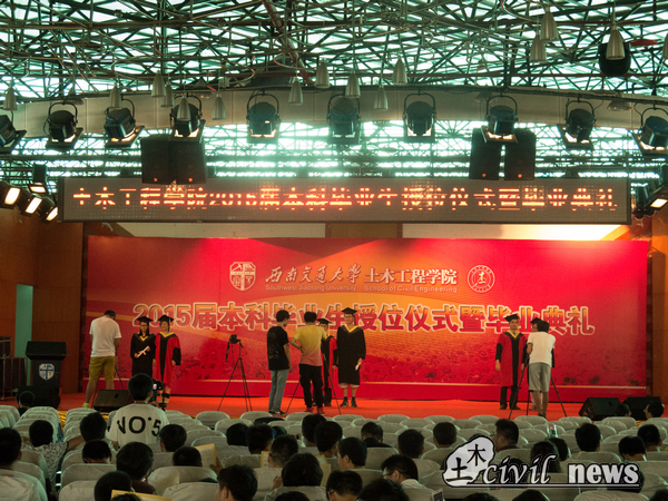 火热六月,栀子花开。6月25日,土木工程学院2015届424名本科毕业生齐聚犀浦校区大学生活动中心,参加土木工程学院2015届本科毕业生授位仪式暨毕业典礼。参加本次授位仪式暨毕业典礼的领导和嘉宾有:土木学院院长、授位委员会主席高波教授,土木学院党委书记、授位委员会委员钱永久教授,土木学院副院长、授位委员会委员易思蓉教授,土木学院副院长、授位委员会委员苏谦教授,土木学院行政办主任周曦,土木学院岩土工程系主任马建林教授,土木学院桥梁工程系副主任唐继舜教授,土木学院铁道工程系副主任刘昌清教授,土木学院岩土中心主任、地下工程系教师代表杨其新教授,土木学院建筑材料教研室主任叶跃忠教授,土木学院防灾减灾研究所主任姚令侃教授,导师代表:刘艳、王耀琴、崔圣爱及土木学院各位党委委员、指导老师、辅导员们。整个仪式由土木工程学院党委副书记李锦红主持。