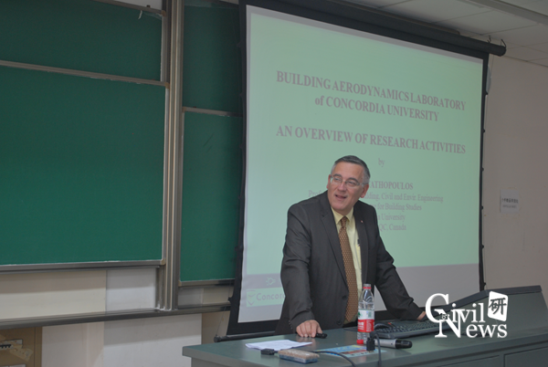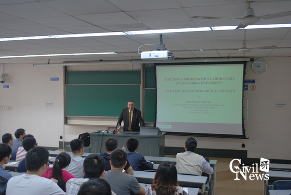 2015年10月11日上午九点半,由研究生院主办,土木工程学院承办的“创源”大讲堂研究生学术系列讲座在我校逸夫馆4417隆重举行。本次学术报告主讲人为Ted Stathopoulos教授。李明水教授、潘毅副教授和近百名研究生参加。