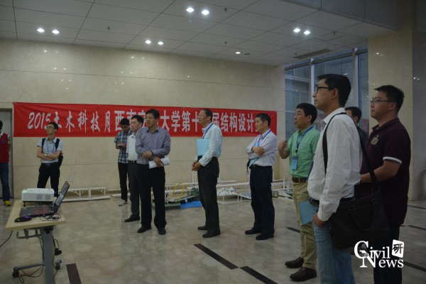 参观伊始,李锦红副书记对“土木科技月”的发展历史以及取得的骄人成绩向评估组专家们进行了汇报。李书记称,土木学院的科技月活动已经成功举行了十五届,在这期间赢得了全校同学们的广泛关注和积极参与,目前已经成为科技创新能力强、专业知识探索深入的省级赛事,通过结构设计竞赛选拔出的优秀学生更是在全国结构设计大赛中屡获第一,在丰富学生课余生活的同时,极大程度地培养了学生的创新意识、创新能力和动手能力。