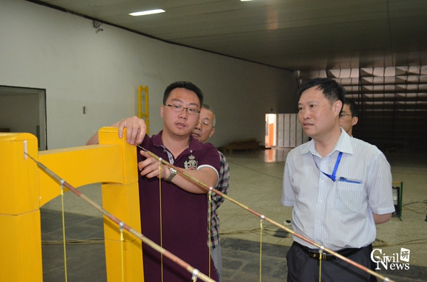 随后,王老师结合实验室中摆放的悬索桥模型从模型相似比、风速相似比、高精度位移监测设备及传感器、独立人员操作平台等方面阐述了风-模型在实验室中的实现过程,着重指出风工程模型试验的重点在于模型的几何尺寸和配重与原型结构的相似关系。除此之外,他还详细介绍了该实验室在涡流变层流处理、风力放大和风循环利用等方面的亮点设计,何处长均十分耐心的进行了听取。
