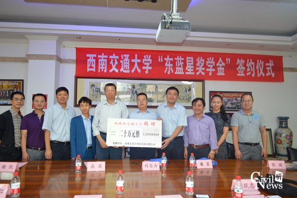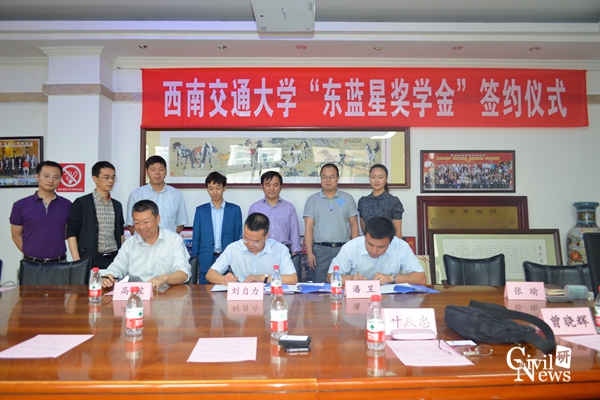 5月22日上午9:30,西南交通大学“东蓝星奖学金”签约仪式在土木馆1208会议室举行。成都东蓝星科技发展有限公司董事长刘自力、副总经理刘应虎、销售部经理谢凯、行政部经理张瑜,土木工程学院院长高波,西南交通大学对外合作与联络处副处长潘昱,土木工程学院建筑材料教研室主任叶跃忠、行政办公室主任周曦、建筑材料教研室曾晓辉出席了本次签约仪式,会议由土木工程学院副书记李锦红主持。