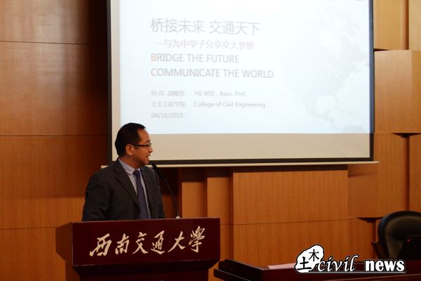 土木工程学院桥梁工程工程系何畏副教授则在最后向大家介绍了西南交大的校徽的由来以及建校史和在历史上、国际上取得的优异成绩。他这样说道:“正如校徽所彰显的土木人杰一样,从土木工程走出的学子们都拥有着踏实、肯干、吃苦耐劳的坚韧品质。”紧接着何教授又向大家简单介绍了桥梁工程,他将桥梁工程比作工程的艺术瑰宝,他强调到其所蕴涵的严谨思维逻辑是不可忽视的。为了能让同学们更好的理解桥梁工程的魅力,何教授向大家展示了国内外著名桥梁,丹山西喉门大桥、武汉长江大桥、旧金山金门大桥等。看着放映的一张张图片,大家发出络绎不绝的赞美声。