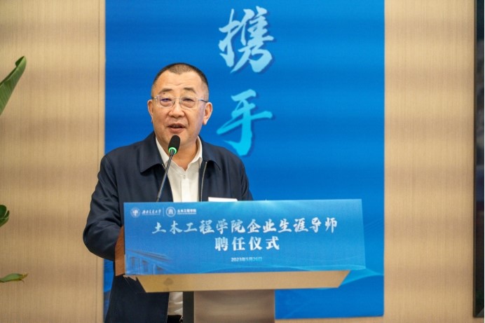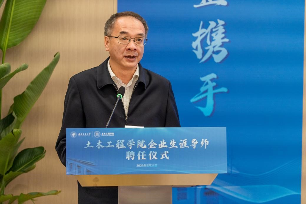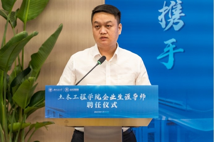 聘任仪式上,土木工程学院党委副书记周曦针对企业生涯导师工作背景及目的、开展情况以及相关优秀做法进行了简要介绍。土木工程学院为进一步引导学生主动对接“一带一路”倡议、交通强国等国家战略,促进学生更高质量、更加充分就业,常态化开展企业生涯导师聘任工作,为每个本科生班级配备2名企业生涯导师。导师遴选主要面向建筑施工单位、设计单位、投资单位、事业单位、土木工程领域相关单位的优秀青年骨干开展。导师工作任务涵盖“五个一”计划,即每学年在所负责班级开展一次主题教育、一次就业指导活动、一次工程实践、一次谈心谈话、一次主题班会。