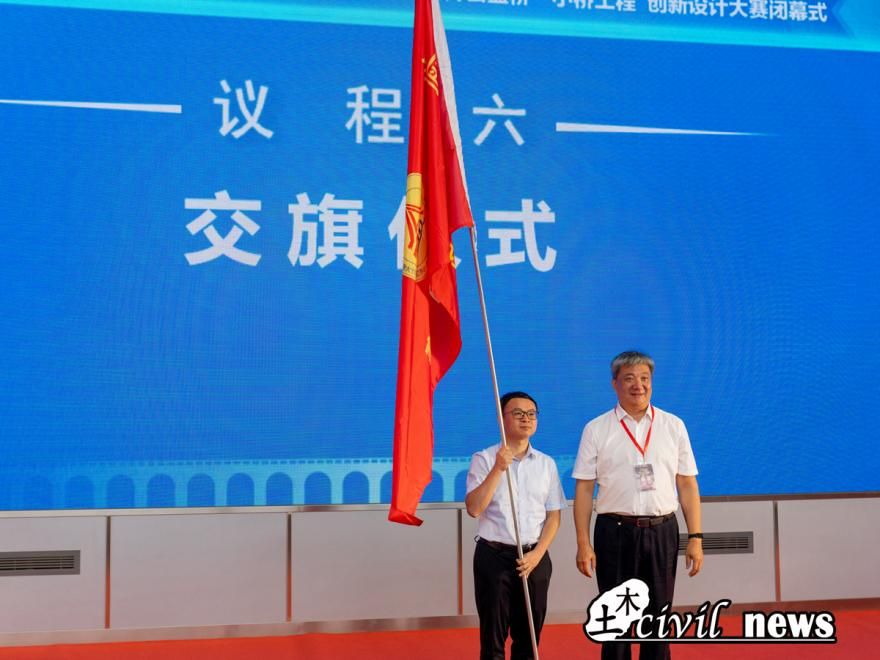 闭幕式最后,进行第五项议程——交旗仪式,并由下届承办单位福州大学发言。首先,福州大学土木工程学院常务副院长赖志超教授对“茅以升公益桥—小桥工程”设计大赛为青年学生搭建绽放平台,也为各高校搭建学术交流、理念交互的平台表示高度认同。同时,赖教授衷心祝贺本次设计大赛取得圆满成功,彰显了青年学子善于创新创造的无限潜能。最后,赖教授向大家发出邀请,欢迎大家积极参与由福州大学承办的下届大赛,期待明年再度相聚。