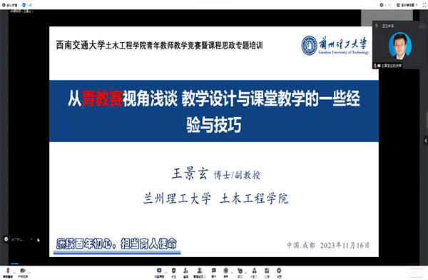 兰州理工大学的王景玄副教授通过远程连线的方式向在场的青年教师分享了自己参加全国高校青年教师教学竞赛并获得佳绩的过程与感受,详细阐述了他在讲授《混凝土结构设计原理》课程一个章节过程中的教学设计、教学思路、教学方法与教学反思,展示了一个优秀的课堂教学范例。