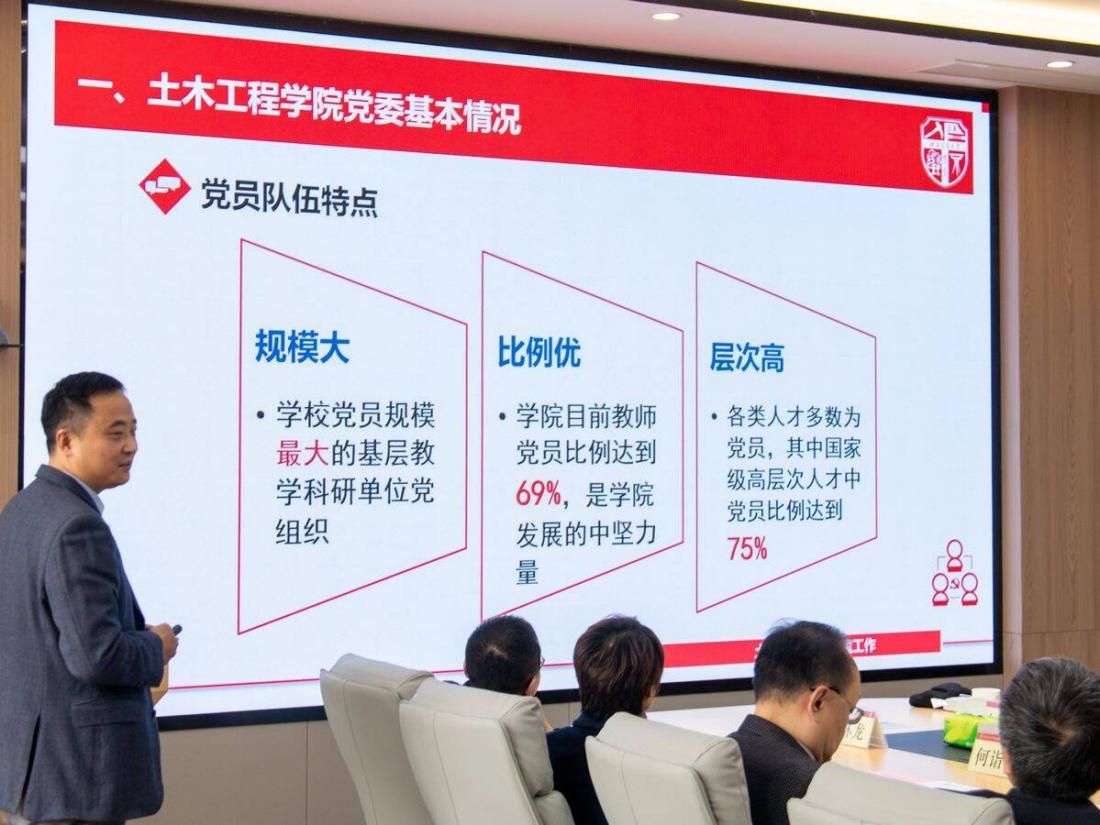 学院党委书记高平平在会上作题为《构建高质量党建工作体系 引领学院转型升级新发展》的报告。他就工作基本情况、建设成效和工作体会等方面汇报土木工程学院党建工作情况。高平平书记指出,土木工程学院党委具有规模大、比例优、层次高的特点。此外党政领导班子着力做到凝聚共识,切实为群众办实事,同心同向共发力,促进学院在安全稳定中不断发展。