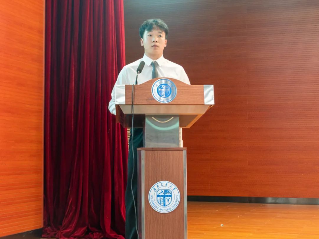 2024级新生张轶焘代表本科新生发言。他回顾了土木工程学院所取得的历史成就,感谢了学院老师和学长学姐的帮助和支持,并且满怀激情地表示将和同学们一道在未来的四年挑战自我,追求卓越,为实现中华民族伟大复兴的中国梦贡献自己的力量。