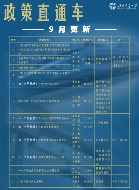 2024年9月19日上午10点,土木工程学院在犀浦校区4417A会议室召开党委和党政联席会议,学院领导班子成员、全体党委委员、科职干部以及部分教师代表参加了本次会议。会议邀请了学校机关与直属单位党委常务副书记沈哲、机关与直属单位党委综合管理办公室副主任奉天、党委教师工作部思政科科长崔健、重大工程办公室(川藏铁路研究院)项目主管邓慧心到会进行了“政策直通车”宣讲。本次宣讲的主要内容是师德师风建设专题和CZ铁路信息安全工作政策专题。