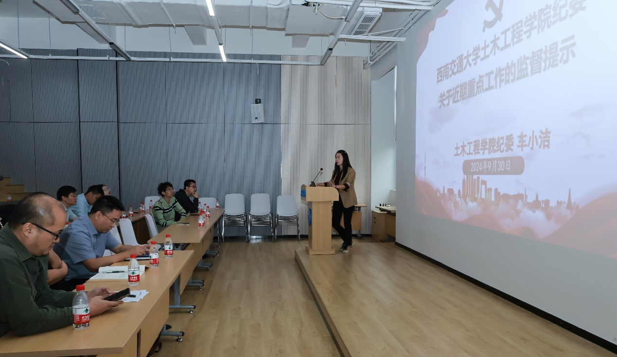 最后,土木工程学院党委副书记兼纪委书记车小洁同志对学院党委和纪委的近期重点工作进行了提示。车书记从师德师风建设和纪律工作两个方面强调了教师工作的重要性,表示各个教工党支部要做好党纪学习教育总结、认真学习贯彻党的二十届三中全会精神。她还充分传达了“纠'四风'树新风”的专题精神,指出各系室要加强2025年推免工作中的纪律要求,同时要进一步规范学校仪器设备资产的使用管理。