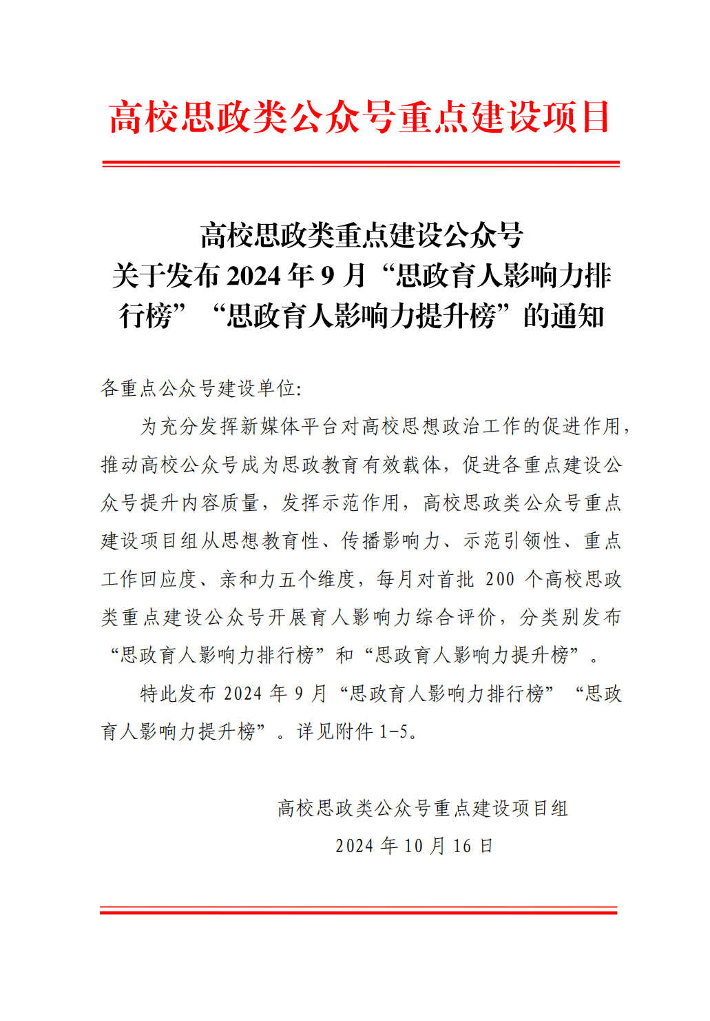 为充分发挥新媒体平台对高校思想政治工作的促进作用,推动高校公众号成为思政教育有效载体,促进各重点建设公众号提升内容质量,发挥示范作用,高校思政类公众号重点建设项目组从思想教育性、传播影响力、示范引领性、重点工作回应度、亲和力五个维度,每月对首批200个高校思政类重点建设公众号开展育人影响力综合评价,分类别发布“思政育人影响力排行榜”和“思政育人影响力提升榜”。