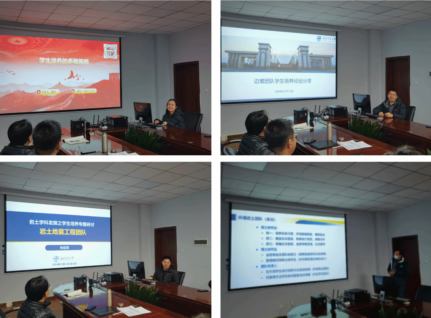 紧接着,活动围绕岩土学科发展之研究生培养开展了专题研讨,首先由杨兵介绍了岩土系研究生的培养情况,然后,各团队负责人袁冉老师、杨涛老师、张迎宾老师和余炎老师交流了各自在科学研究、日常管理等方面的经验,此后,大家在导师联培、学术不端、成果署名以及团队氛围等方面积极开展了热烈的交流。