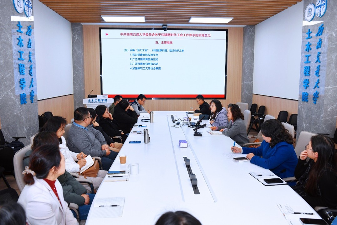 本次工作研讨会是土木工程学院贯彻落实新时代工会工作方针、加强工会组织建设的重要举措。会议对于提高工会干部的业务能力、增强工会组织的凝聚力、推动学院和谐发展具有重要意义。会议分为两个阶段,第一个阶段,由王艺霖主席领学《中共西南交通大学委员会关于构建新时代工会工作体系的实施意见》;第二个阶段,各系室工会小组长总结2024年工会工作,并对2025年工会工作提出意见和建议。