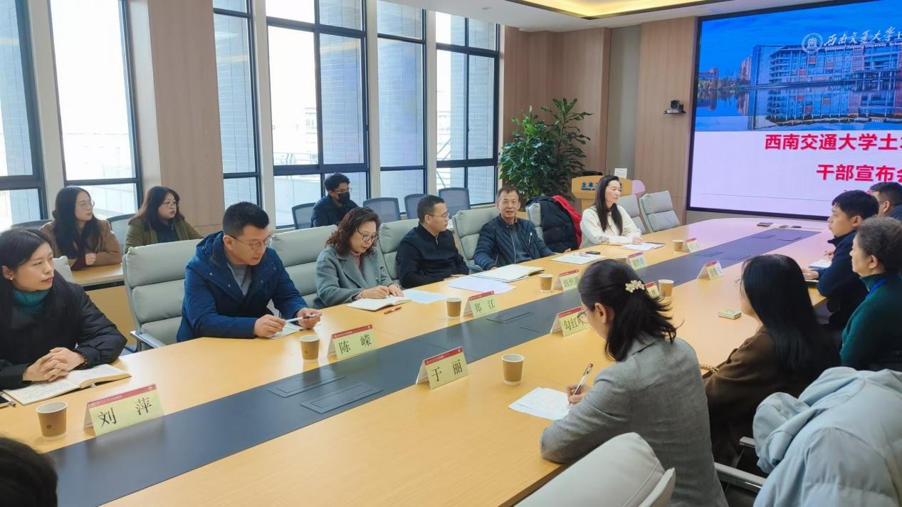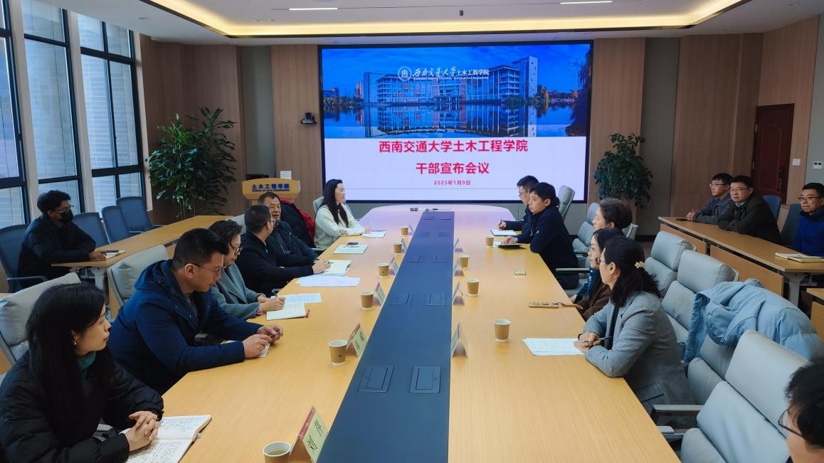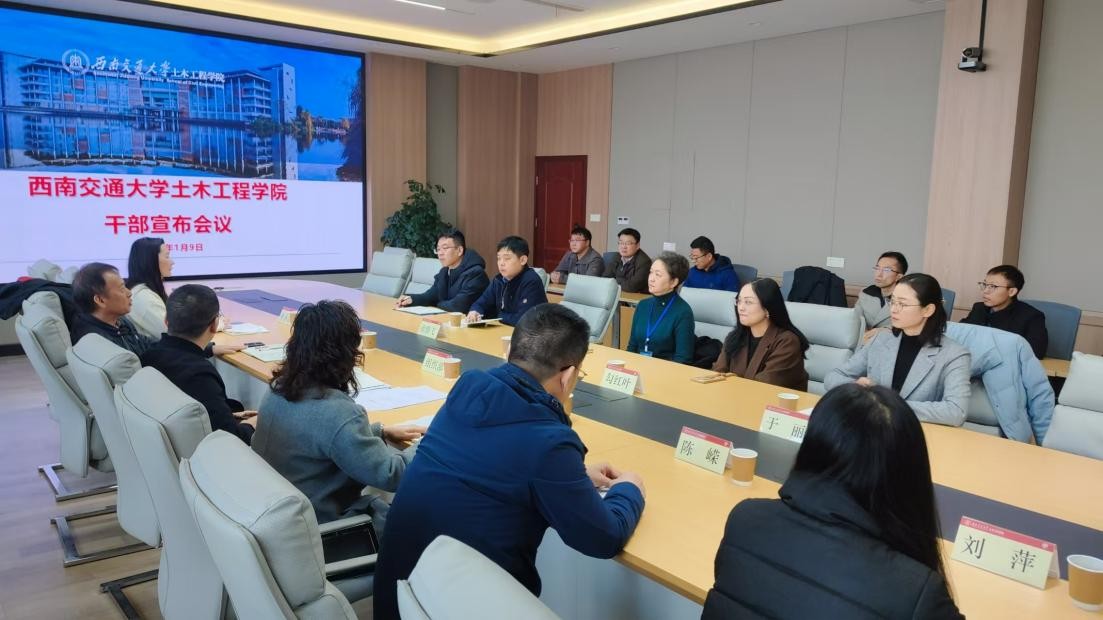 2025年1月9日上午11时,学校党委在犀浦校区四号楼4417A会议室召开土木工程学院干部任免宣布会议。党委组织部党校副校长燕莆龙到会宣布,土木工程学院领导班子成员、各系(中心、部门)负责人、教职工党支部书记及部分教师代表参加会议。会议由学院党委书记郑江主持。