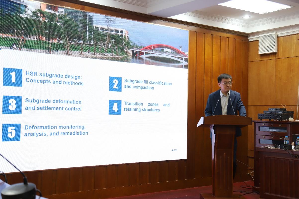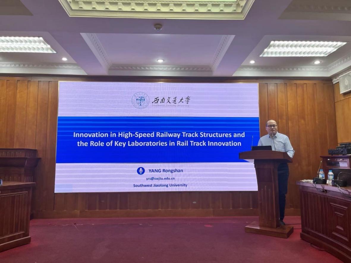 1月9日,学术论坛正式召开。我校刘先峰副主任(线上参与)、杨荣山教授和王腾飞副教授分别发表学术报告,与参会专家学者深入交流。刘先峰教授报告题为《Insights into the Construction of Standard System for Railway Interconnectivity》,介绍了高铁建设标准体系的搭建,并分享了中国标准在国际铁路互联互通中的重要作用。杨荣山教授通过《Innovation in High-Speed Railway Track Structures and the Role of Key Industry Laboratories in China》报告,深入阐述了无砟轨道与有砟轨道的技术特点,回顾了中国无砟轨道技术的演变与行业重点实验室在推动技术进步中的作用。王腾飞总结了题为《Recent Advances and Practices in High-Speed Railway Earth Structures in China》的学术内容,详细介绍了高铁路基结构设计理念、沉降与变形控制技术、过渡段设计及支挡结构选型等前沿内容,并分享了中国在高铁路基病害整治中的经验。