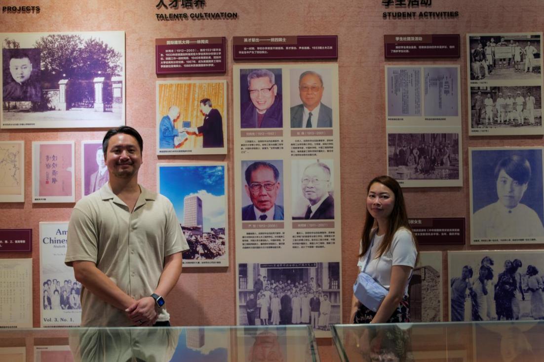 随后,夫妇二人来到校史馆。在关于学校“黄金时代(1920-1937)”的展陈中,林同炎先生的事迹被重点呈现。讲解员详细介绍了林同炎先生1931年从唐山交通大学(西南交大前身)毕业后,在工程领域取得的开创性成就:1967年凭借卓越的学术造诣当选美国国家工程院首位亚裔院士;1986年里根总统亲自为其颁发美国国家科学奖章——这是美国科学界的最高荣誉。一张张珍贵的照片,一段段详实的文字,串联起林同炎先生将交大精神远播海外、造福世界的辉煌历程。