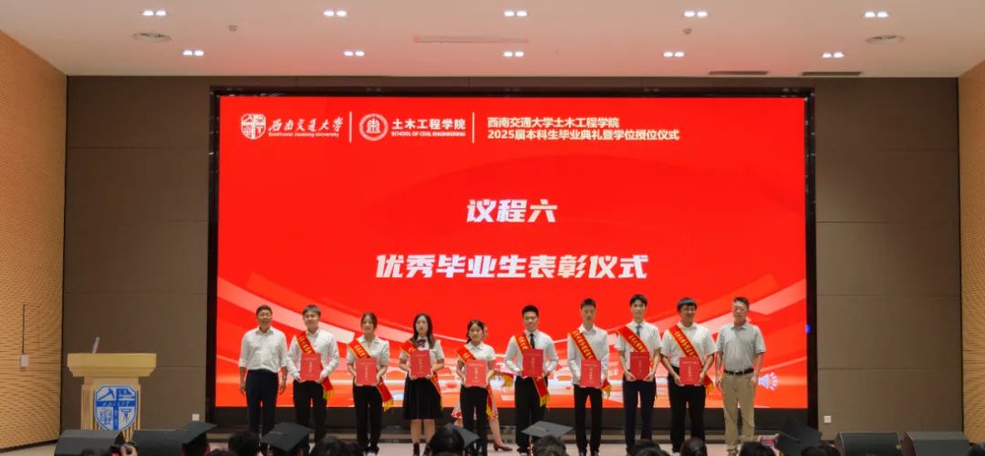 郑江书记宣读《土木工程学院2025届优秀毕业生表彰决定》,由庄卫林、王志杰老师为优秀毕业生代表颁发荣誉证书。