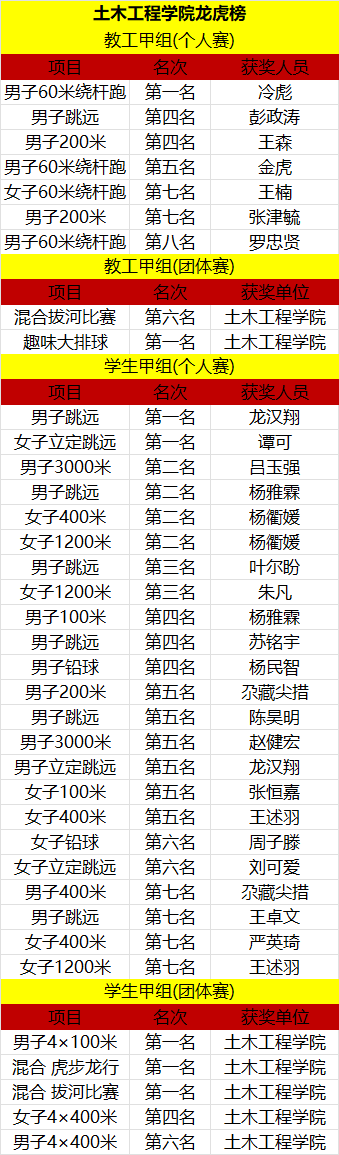 凭借不懈拼搏与强劲实力,土木工程学院再度斩获学生甲组团体总分冠军、教工甲组团体总分第四,荣获体育道德风尚奖,实现运动会学生甲组团体总分三连冠的光荣战绩,用实力铸就荣耀,以拼搏续写传奇。