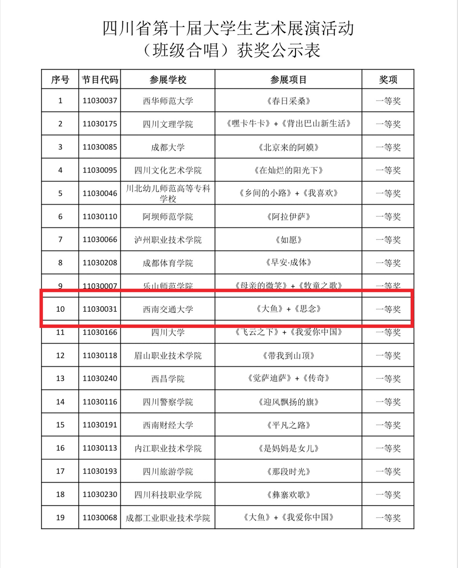 为进一步推动五育并举发展,展示我省高校艺术教育成果,展现当代青年大学生的精神风貌,由四川省教育厅主办,成都师范学院承办,温江区人民政府协办的四川省第十届大学生艺术展演活动在成都师范学院举行。经专家评审,此次展演中声乐(班级合唱)获奖名单出炉。在本次展演中,bat365中文官方网站参展项目《大鱼》以及《思念》荣获一等奖。获奖名单公示如下: