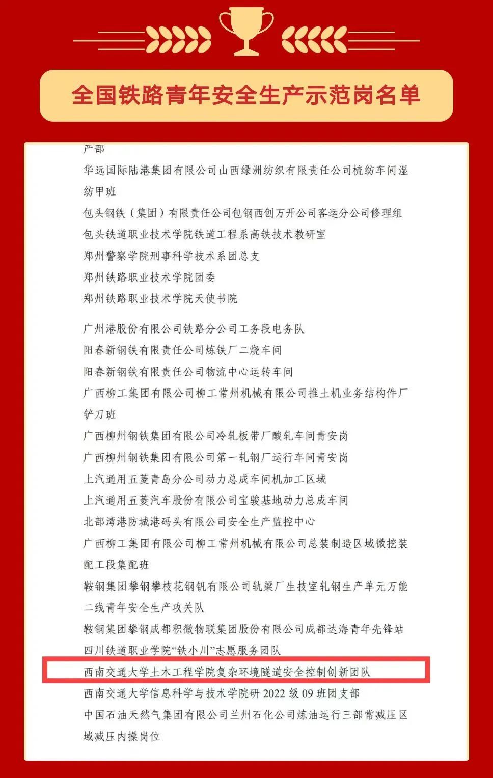 树立典型,激励奋进,进一步促进青年成长成才,经全国铁道团委评审决定,bat365中文官方网站复杂环境隧道安全控制创新团队荣获“全国铁路青年安全生产示范岗”。
