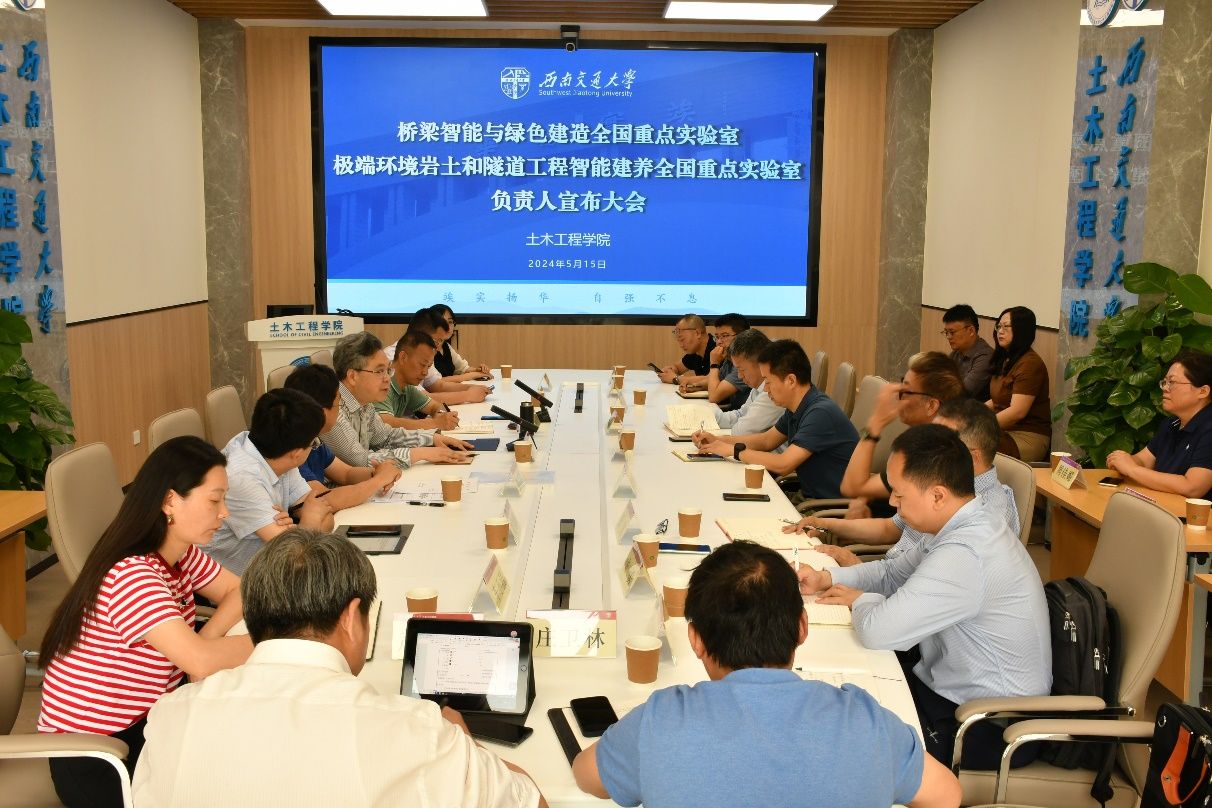 晏启祥代表学校宣布了全国重点实验室的成立通知和相关负责人的聘任决定。经学校研究决定,两个全国重点实验室作为学术机构实体运行,均挂靠土木工程学院管理,任命李永乐为“桥梁智能与绿色建造全国重点实验室(西南交通大学)”主任,郭健、魏凯、余志祥为副主任;任命何川(兼)为“极端环境岩土和隧道工程智能建养全国重点实验室(西南交通大学)”主任,汪波、方勇、张迎宾为副主任。