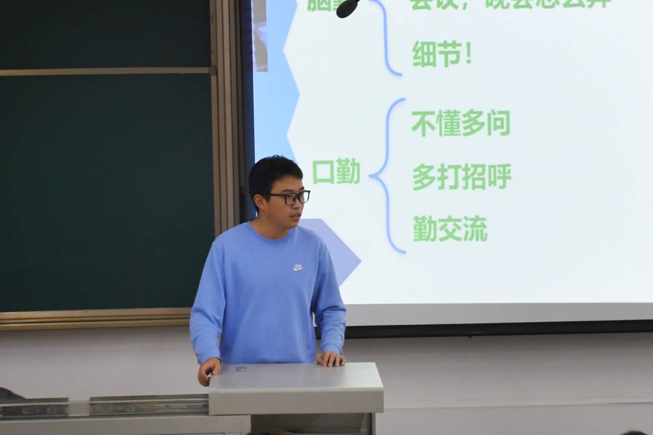 同一时间,“新生团学组织干事能力素质提升”专题培训在X2418教室开展。郭哲维老师“从‘新’出发,卓越担当”作为主题,分享了自己从干事到干部,再到辅导员的经历,让学生深刻体会团学组织的建设力和凝聚力。接着,郭老师以“学生会报销规范”为例,强调团学组织干事需要重视细致办事能力的培养。同时,郭老师分享了如何平衡学习与工作,面对挫折和保持热情的方法。最后,郭老师祝愿全体干事能永葆初心,用热情点燃梦想,用实干书写担当!