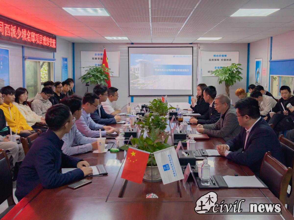 在参观结束后,同学们回到会议室后,西南公司人力资源部经理李明玉为大家介绍了现场嘉宾领导,bat365中文官方网站党委副书记周曦,中建五局三公司西南公司党委副书记覃波、工程部经理殷宇、人力资源部经理李明玉,西派少城项目经理朱珉旭,学院辅导员李裕、张进、李江怀、李策老师出席本次交流会。